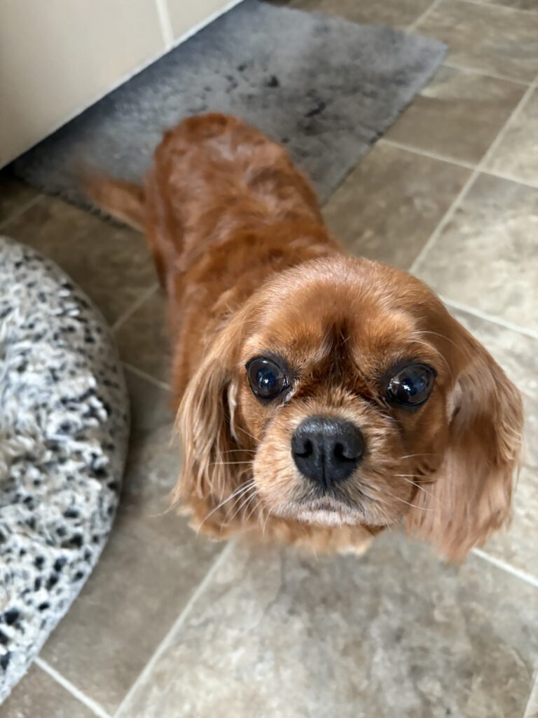 Ruby is a 7 year old female KCC, weighing about 15#. She is doing well on house breaking and is crate trained. She is gentle and sweet natured. Ruby is able to walk on leash with a properly fitting harness. A fenced yard is recommended for her safety as she is used to running loose in a fenced yard. Ruby gets along well with other dogs; we don’t know if she has experience with cats. She is up to date on vaccinations, heartworm negative and will be spayed soon, at which time she will have a dental cleaning. Therefore, we expect she will be ready for adoption around March 9. Her adoption fee is $400. Call or text Mary at (574) 524-6040 if you have additional questions. You can also complete our online adoption application on the Adoption link.